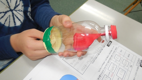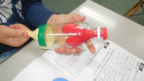 その後は、ペットボトルと風船を使って、肺の模型を作りました。